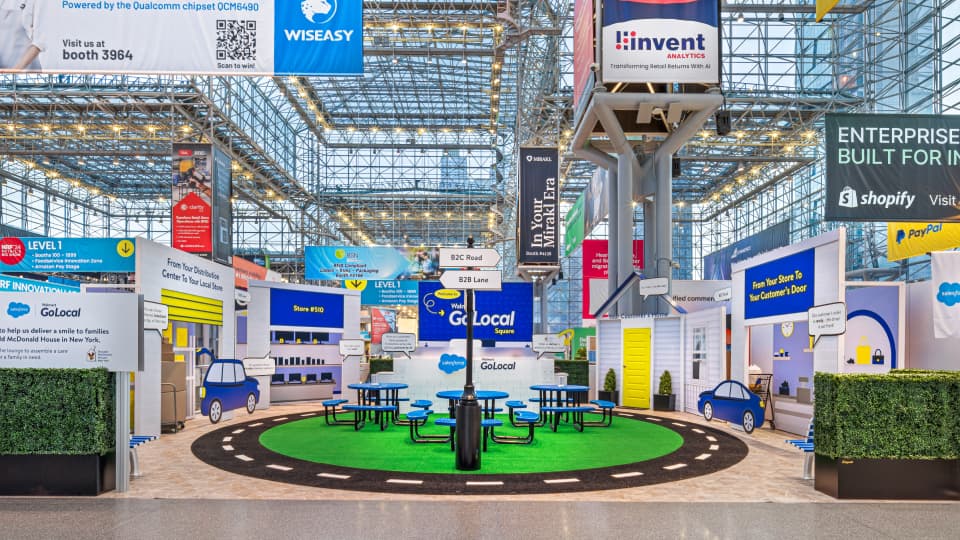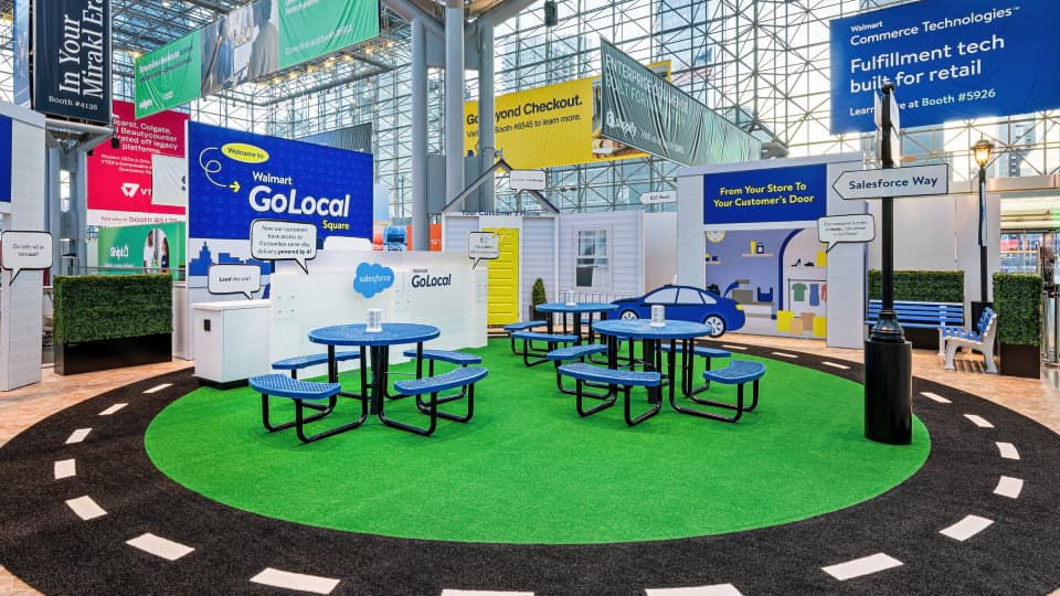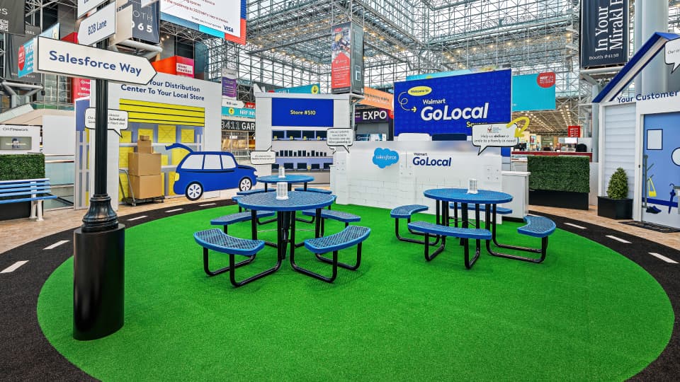 Sparks designed a special 34x40 exhibition space at NRF for Walmart GoLocal. Showcasing their delivery service journey, the space was inspired by small-town squares and featured different areas that represented delivery stops, signs to help customers find their way, and opportunities to donate to charity. The space was created with custom graphics and different types of flooring to make it comfortable. Walmart attendees enjoyed its engaging atmosphere, capturing Insta-worthy moments.